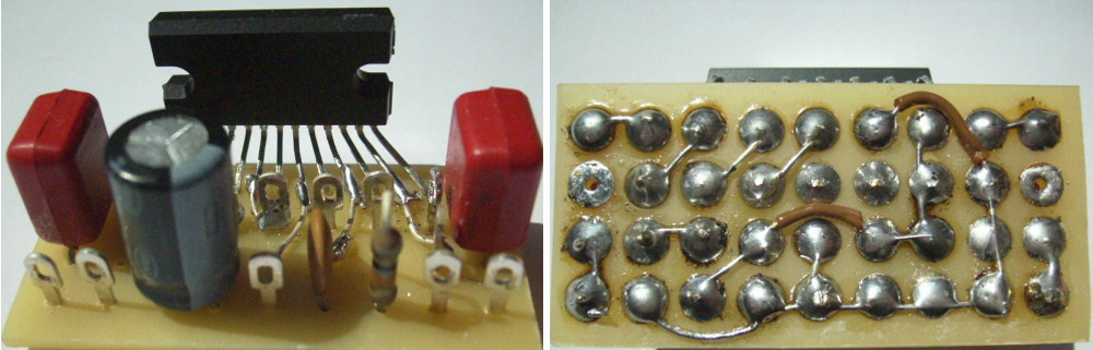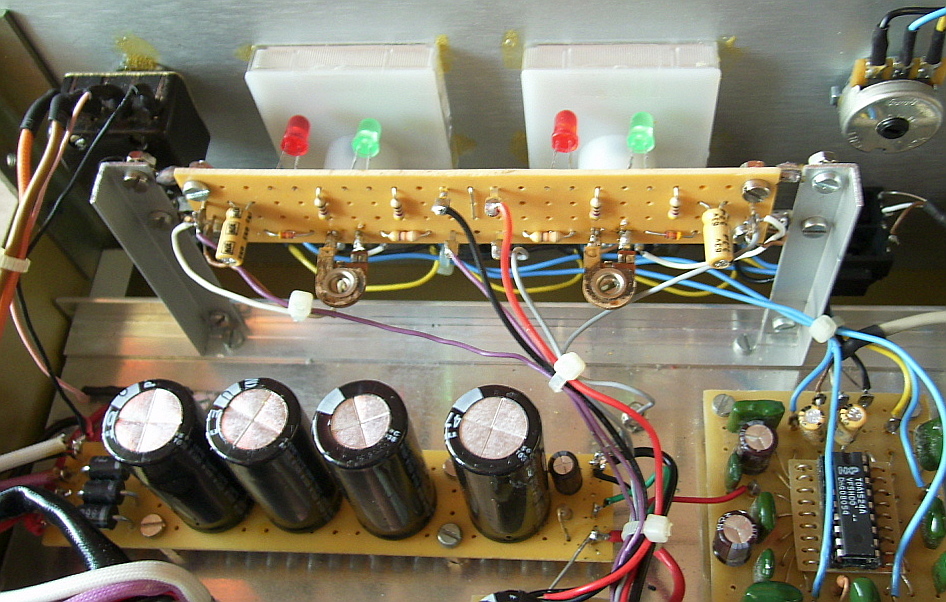 Bei der Konzeption der Pegelanzeige war die Brückenschaltung der Endstufe zu berücksichtigen, weil dadurch keine der beiden Lautsprecherklemmen mit Masse in Verbindung steht. Bei der verwendeten Schaltung ist die als Anzeigegleichrichter geschaltete Diode hochhohmig mit den Lautsprecherklemmen verbunden, so dass nachteilige Auswirkungen in Bezug auf den Klirrfaktor zu vernachlässigen sind. Die Leitungen von den Endstufen-Ausgängen zur Anzeigeplatine sind verdrillt. Durch diese Maßnahme wird vermieden, dass sie quasi als Antennen wirken und so über die Verdrahtung auf die Endstufen-Eingänge zurückwirken könnten, was hochfrequente Schwingungen zur Folge hätte.