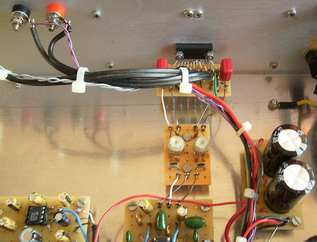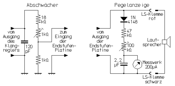 Die Verstärkung der Klangeinstell-Baugruppe beträgt bei voll aufgedrehter Lautstärke 21,5dB (Klangregler in Mittenstellung). Weil diese Verstärkung im vorhandenen Konzept nicht benötigt wird und die Klangeinsteller-Baugruppe einen für die Endstufe zu hohen Ausgangspegel liefert, sind zwischen Klangeinstell-Einheit und Endstufe, wie auf dem Foto zu sehen, einstellbare Abschwächer eingefügt. Vor dem Klangeinsteller geschaltet, wäre sein Dyamikbereich nicht voll ausgeschöpt, was letztlich zu einem schlechterem Signal-Rauschverhältnis führen würde. Wie sich aus der Schaltung ergibt, ist der Abschwächer abgleichbar, so dass sich beide Verstärkerkanäle auf exakt gleiche Verstärkung justieren lassen (Balance-Einsteller in Mittelstellung). |