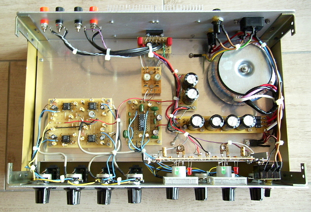Der hier vorgestellte Selbstbau-Mischverstärker leistet maximal ca. 2x40 Watt. Er ist für 230-Volt-Netzbetrieb und zum Anschluss an 12-Volt-Bordnetze geeignet. Es sind vier mischbare Stereo-Eingänge vorhanden, an die z.B. Keyboards, Ausgänge von Stereo-Gitarren Effektgeräten, MP3-Player oder Notebooks angeschlossen werden können. Er eignet sich damit gut für Fielddays, Outdoor-Partys und Straßenmusik-Aufführungen. Durch Anschluss eines oder mehrerer Mikrofon-Vorverstärker kann das Gerät auch als Karaoke-Verstärker eingesetzt werden. Im Gerät ist genügend Platz vorhanden, um solche gegebenfalls noch einzubauen.