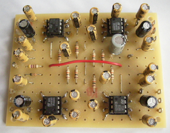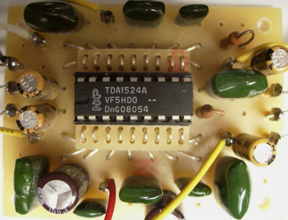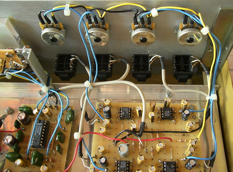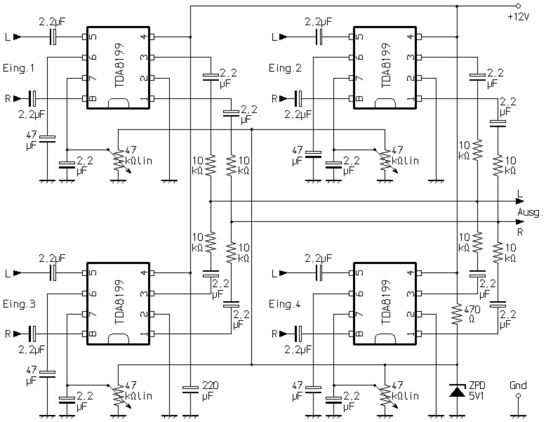 Der in der Mischer-Einheit verwendete Schaltkreis TDA8199 wurde eigentlich zur Lautstärke-Einstellung in TV-Empfängern entwickelt. Er ist zweikanalig, also für Stereo gedacht und wird hier somit jeweils pro Mischkanal einmal benötigt. Folglich wird er für die vorhandenen vier Mischerkanäle insgesamt vier mal benötigt. Die Mischerschaltung muss recht hochohmig abgeschlossen werden, eine Bedingung, die von der direkt nachgeschalteten Baugruppe mit dem TDA1524A erfüllt wird.