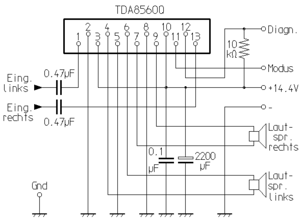 Clipping-Betrieb bzw. Übertemperatur können über den digitalen Diagnose-Ausgang (Pin 12) ausgelesen werden. Wenn Pin 11 nicht an Plus liegt, schaltet die Endstufe auf Standby-Betrieb. Dadurch kann über ein einfaches RC-Glied eine elektronische Einschalt-Verzögerung realisiert werden. Dazu ist lediglich ein Widerstand zwischen Pin 11 und Plus zu schalten, sowie ein Elko von Pin 11 nach Minus. Mit einem 10kΩ-Widerstand und einem 100µF-Elko liegt die Zeitkonstante bei einer Sekunde. Mit in etwa dieser Verzögerung schaltet sich die Endstufe dann sanft und ohne störendes Knacken ein.