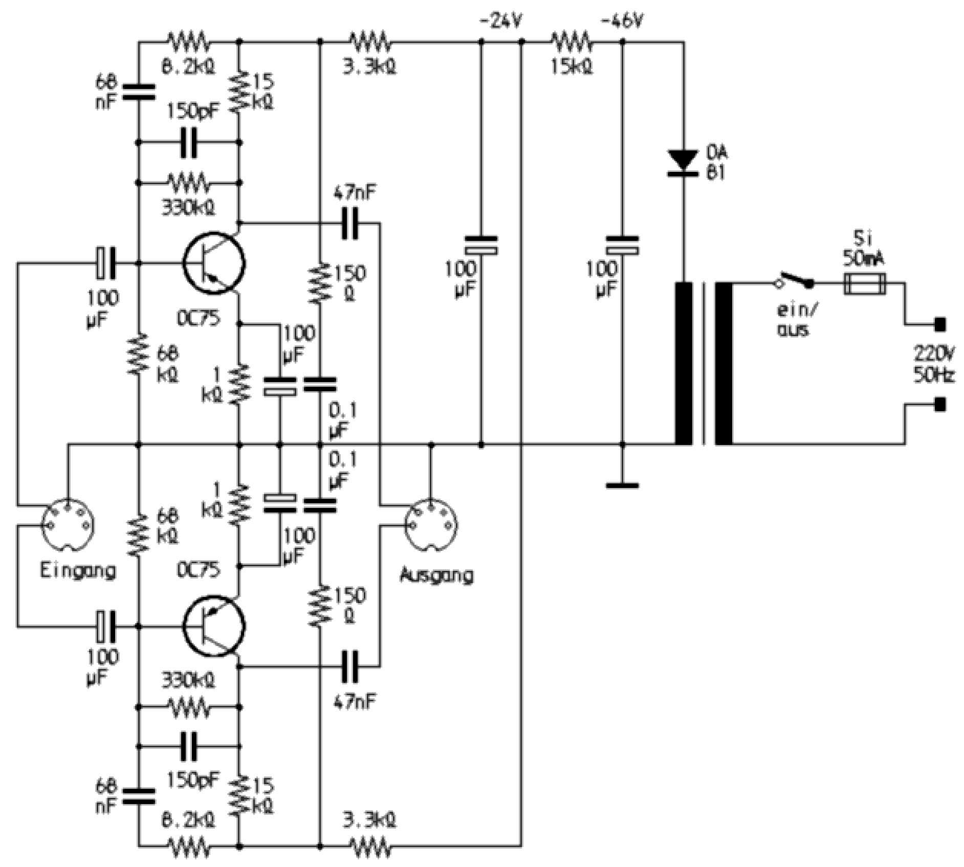 Die veralteten Germanium-Transistoren können durch Sillizium-Typen ersetzt werden, wenn die 68-KOhm-Widerstände auf etwa den 2,5-fachen Wert vergrößert werden. Sollen NPN-Typen (z.B. BC550C) verwendet werden, müssen die Elkos und die Diode anders herum eingebaut werden. Die Schaltung geht auf ein Gerät von Philips zurück. Ein solcher Vorverstärker lässt sich direkt im Plattenspieler-Gehäuse oder im Stereo-Verstärker unterbringen oder aber auch als eigenständiges Zusatzgerät betreiben. Mit dieser einstufigen Anordnung wird eine Verstärkung von ca. 30 dB erzielt. Dies reicht aus, einen Verstärker auszusteuern, der einen Lineareingang mit etwa 50...100mV Eingangsempfindlichkeit hat. Da der Ausgang hochohmig abgeschlossen sein muss, eignet sich die Schaltung insbesondere in Kombination mit einem Röhrenverstärker. |