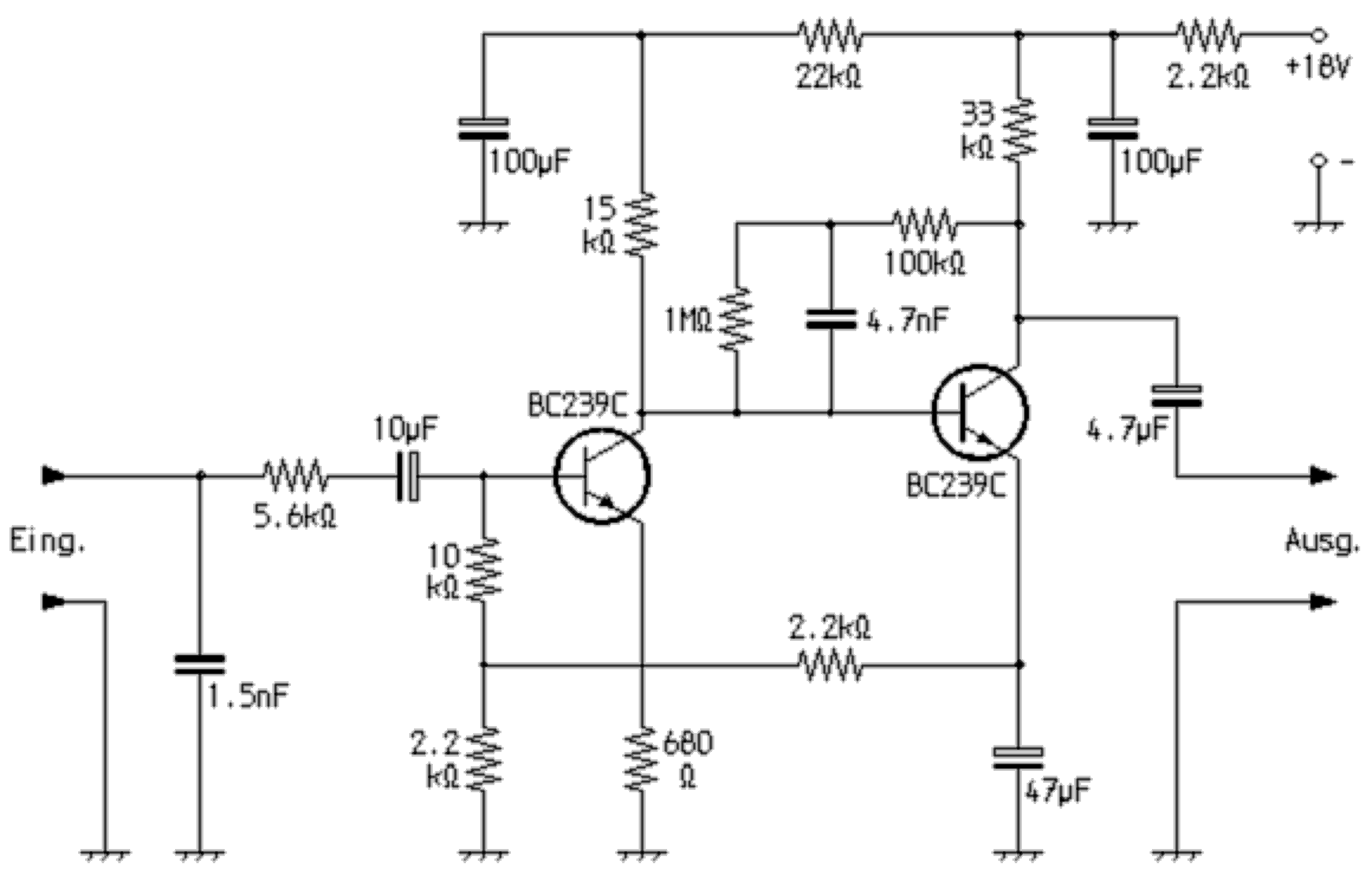 Die mit dieser zweistufigen Anordnung erzielte Verstärkung reicht aus, das kleine Signal vom Tonabnehmersystem soweit anzuheben, dass ein mittelohmiger Lineareingang mit ca. 250...500mV Eingangsempfindlichkeit ausgesteuert werden kann. Für Stereo wird die Schaltung selbstverständlich zweimal benötigt. Der Frequenzgang ist in etwa gegensätzlich der Schallplatten-Schneidkennlienie, so dass sich eine ausgewogene Wiedergabe ergibt. Mit dem 1,5nF Kondensator im Eingang werden die Höhen entsprechend abgesenkt und mit der Gegenkopplung über den 4,7nF-Kondensator die Tiefen angehoben. |